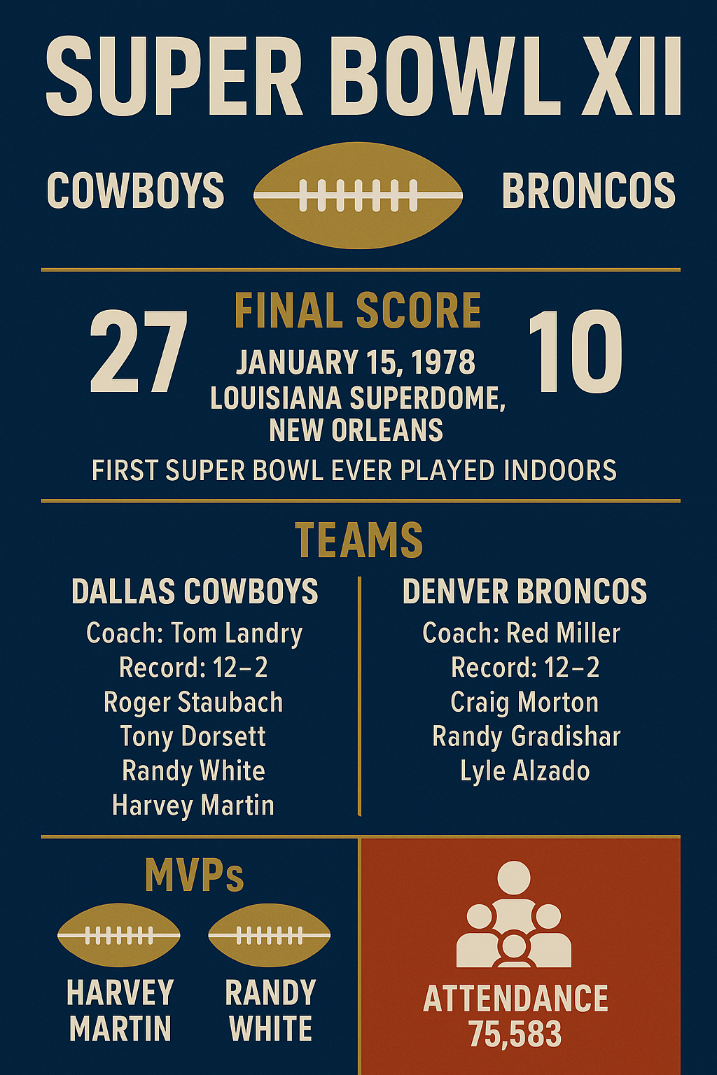 Super Bowl XII, played on January 15, 1978, at the Louisiana Superdome in New Orleans, marked a pivotal moment in NFL history. It was a clash not only between two powerhouse franchises—the Dallas Cowboys and the Denver Broncos—but also between two contrasting styles of football: the defensive juggernaut of Dallas’s “Doomsday Defense” and the improbable rise of a Denver team built around grit, defense, and a fanbase experiencing its first taste of glory. The game also made history as the first Super Bowl played indoors and the first to award co-MVP honors. For fans of football and sports history, Super Bowl XII remains a defining contest that showcased the strategic depth and evolving spectacle of America’s most-watched game.