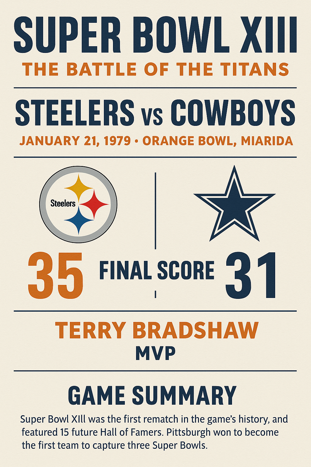 Super Bowl XIII, held on January 21, 1979, at the Orange Bowl in Miami, Florida, was a clash of NFL titans that lived up to every bit of its pre-game hype. Pitting the Pittsburgh Steelers against the Dallas Cowboys, it marked the first Super Bowl rematch and is often hailed as one of the most competitive and star-studded games in NFL history. With legendary players, high-stakes drama, and iconic moments, Super Bowl XIII stands as a benchmark for all championship games that followed.