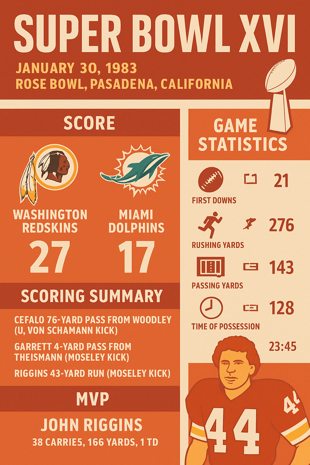 On January 30, 1983, in front of over 100,000 fans at the Rose Bowl in Pasadena, California, the Washington Redskins and Miami Dolphins squared off in Super Bowl XVII, a game defined by power football, redemption, and grit. Washington’s 27–17 victory, driven by the unstoppable force of John Riggins and anchored by a suffocating defense, marked the franchise’s first Super Bowl title and a shift in the NFL landscape.